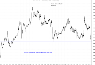 Following is a chart detailing the Gold/Silver ratio giving an indication of how strong silver has been compared to gold in recent weeks. The ratio appears to be getting ready to challenge the 42 level which sets it up to move towards the more extreme of its 30 year range with the first stop near 32