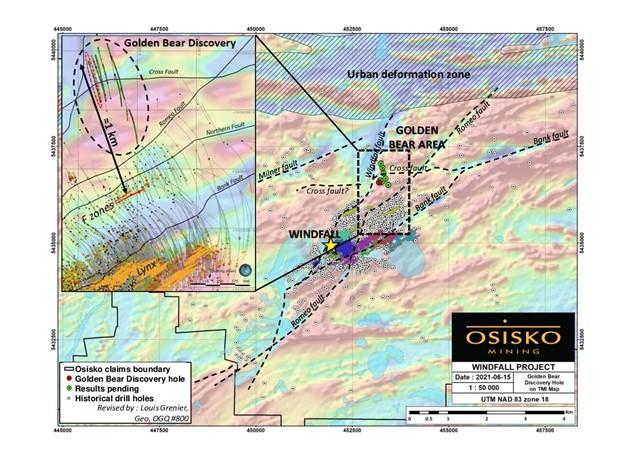 One of the most important regional developments is the discovery of the Golden Bear zone to the north of the current Windfall resource area, with the initial discovery hole (UB-21-132) intercepting 6.7 meters of 63.6 grams per tonne gold. Osisko has since released more intercepts from this large step-out target to the market, confirming the initial discovery hole. So far, follow up drilling at the Golden Bear has yielded exceptional results, with 22 intercepts coming in at an average length of 1.8 meters at an average grade of more than 15 grams per tonne gold.