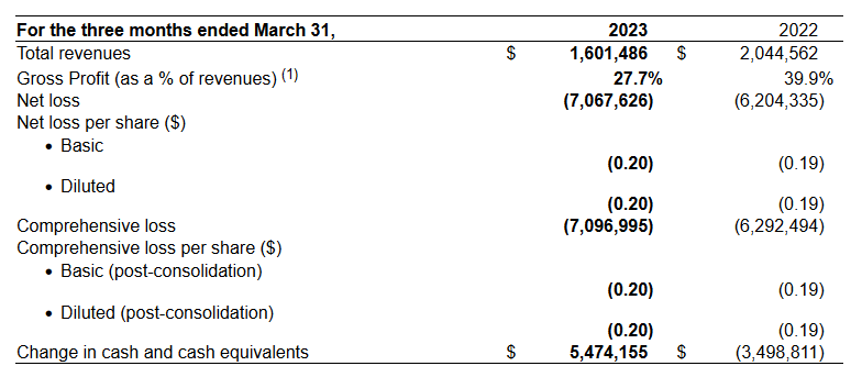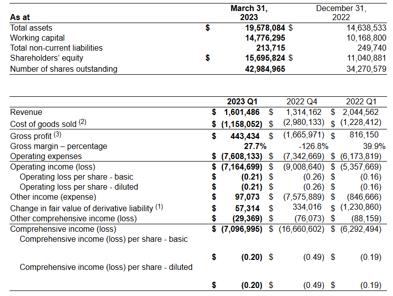 • The Company recorded a comprehensive loss of $7,096,995 in the first quarter of 2023 compared to a loss of $6,292,494 in the same period of 2022. The comprehensive loss for the period includes non-cash changes comprised of a positive change in fair value derivative of $57,314 and a write down of inventory of $77,047 and would otherwise have bee a loss of $7,077,262. The first quarter of 2022 comprehensive loss for the three months ended March 31, 2022, include a negative change in fair value of derivative liability of $1,230,860, an impairment recovery on notes receivable of $771,260, and would otherwise be a comprehensive loss of $5,832,735. Contributors to the year-over-year increase are office and miscellaneous, advertising, marketing and investor relations expenses, and wages that were partially offset by decreases in insurance expense.