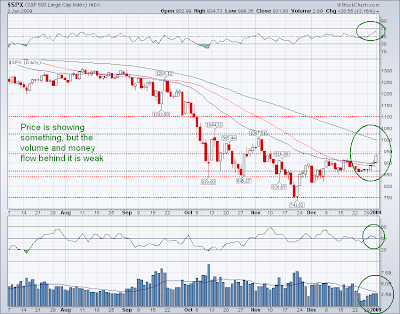 Chart 2: Same SPX chart showing weak money flow and low volume