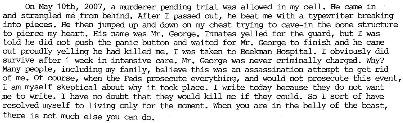 First let’s review the facts… whatever you believe about his innocence or guilt or innocence of any crime, the facts are that he was never put on trial for any crime. He was held in contempt of court for not producing what the judge ordered him to produce, something which he claims he didn’t have. He was placed in MDC Manhattan and was basically TORTURED. According to Nancy, he was locked in solitary confinement for almost the entire duration, suffering days on end and at times was intentionally awaken every hour or so all night long, night after night, in an attempt to get him to sign a confession. He was repeatedly told that he would not get the chance to see his 91 year old mother alive again if he did not sign the confession. This took place off and on for SEVEN YEARS. Then one day a huge convict, “a known homicidal maniac” named George, was locked in his cell with him where he proceeded to beat and strangle him until he thought he was dead. Later, according to Armstrong, a fellow inmate stated that the guards watched the beating and refused to open the door to stop it. He lost most of his teeth, and now, over two years later is still missing them because the prison system only has one dentist for over 5,000 inmates. He suffered a detached retina, broken ribs and other internal injuries that left him in intensive care.