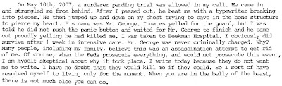 Why would this be happening now with a little more than a year before he is eligible for parole? I and others contend that it is because of his recent writing activity and because of his recent interview with the New Yorker Magazine (- The New Yorker - "The Secret Cycle…"), and also because there are now several media outlets requesting to do interviews with him – the prison simply does not want, for whatever reason, the access that we have been enjoying lately to continue. I spoke directly to Martin’s younger sister, Nancy, and this is her opinion as well. She is very upset over this move as she, “fears that he may not make it out.” She claims that Martin is very much afraid of this move and for good reason…
