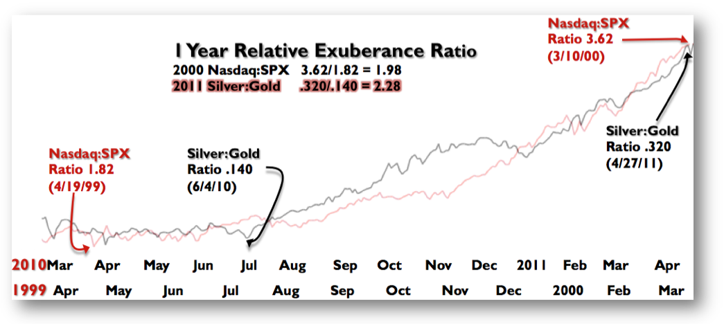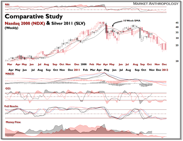 To further color what I perceived to be the unbridled risk appetite within the silver market, I contrasted silver with the parabolic rise and break of the Nasdaq market in 2000. Interestingly, both markets have traded very similar, both through the parabolic rise and breakdown, when contrasted with the relative strength of their closest cousins - the SPX for the NDX and GLD with SLV (see Here).