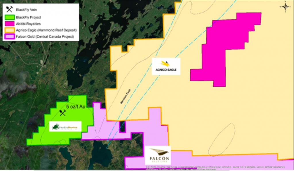 Blackfly is ~14 km southwest along strike of Agnico Eagle’s Hammond Reef deposit, which has 4.5M oz. gold. A resurgence of interest in the Atikokan camp is due to development of Hammond Reef and Agnico staking & acquiring surrounding land. On top of Agnico, IMT, Falcon Gold, Abitibi Royalties & Portofino Resources have also secured properties.