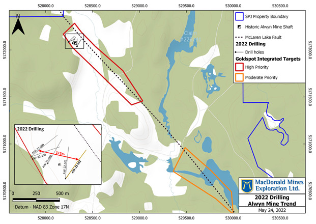 Phase 1 of drilling in the Alwyn Mine Copper-Gold (Cu-Au) Trend consisted of five oriented diamond drill holes, totalling 665m. Variably dense and multi-directional networks of quartz-carbonate to carbonate veins, comparable to the networks of veins associated with Copper-Gold (Cu-Au) mineralization at surface, were intersected in four out of the five drill holes. Iron oxide alteration occurring as sporadic specular to earthy hematite veinlets was also observed in conjunction with certain zones of chalcopyrite mineralization and more broadly in the Alwyn area. Observations made in these holes demonstrated the potential for the Alwyn Mine Copper-Gold (Cu-Au) trend to extend southeast of its currently known footprint, as it was predicted by GoldSpot (see news release May 3, 2022). MacDonald's drilling also confirmed veining and mineralization over a 115m strike length and that mineralization remains open in all directions (Figure 2).
