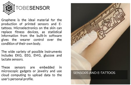 This technology can be combined with another graphene-based application: hi-tech sensors. In Part Two, investors already read about the GrapheneCA “e-tattoo.” This is a printed sensor that can be attached to the skin surface via a plastic film, not unlike children’s tattoos. The difference is that this e-tattoo holds graphene-based microelectronics aside from ordinary ink.